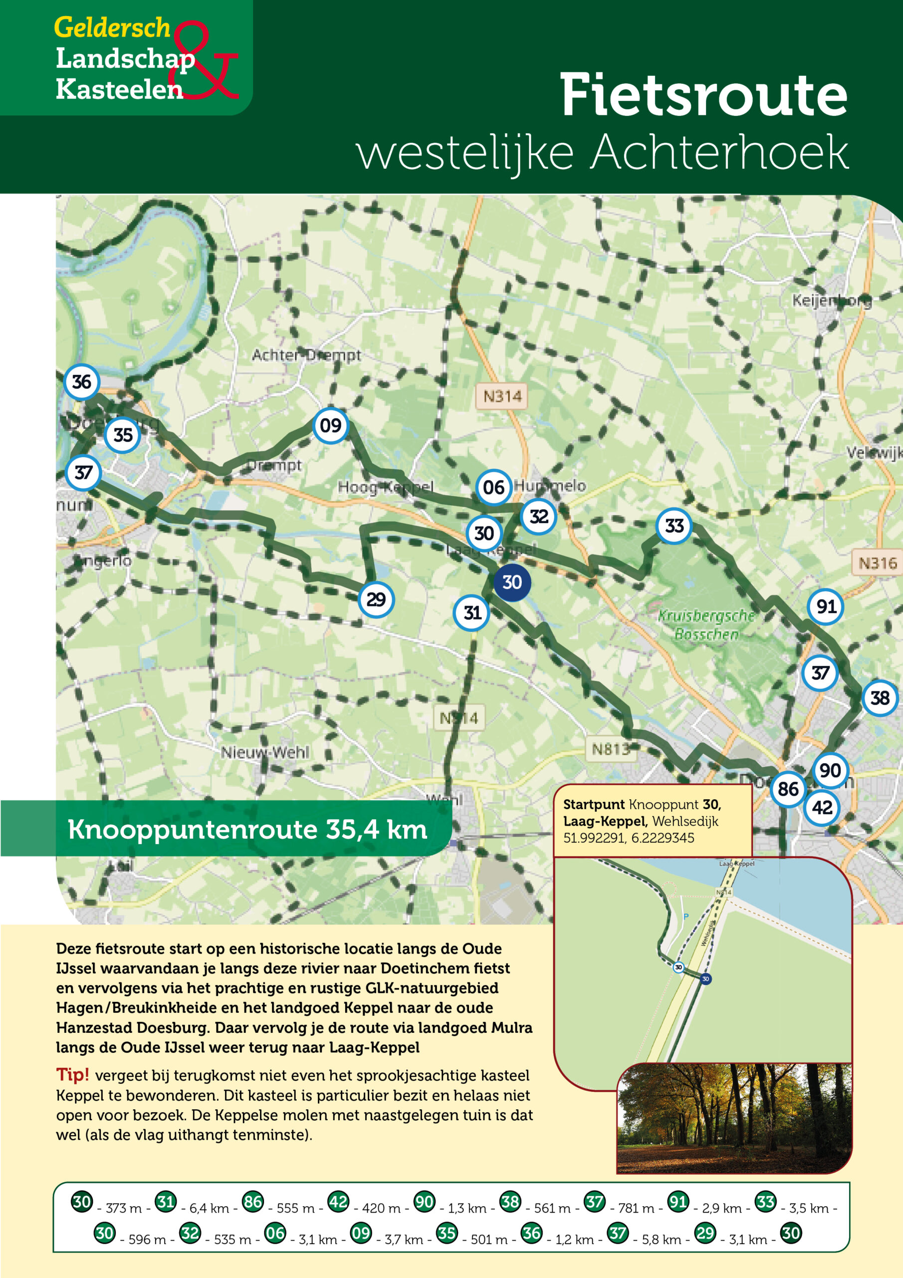 Deze fietsroute start op een historische locatie langs de Oude IJssel waarvandaan je langs deze rivier naar Doetinchem fietst en vervolgens via het prachtige en rustige GLK-natuurgebied Hagen/Breukinkheide en het landgoed Keppel naar de oude Hanzestad Doesburg. Daar vervolg je de route via landgoed Mulra langs de Oude IJssel terug naar Laag-Keppel.