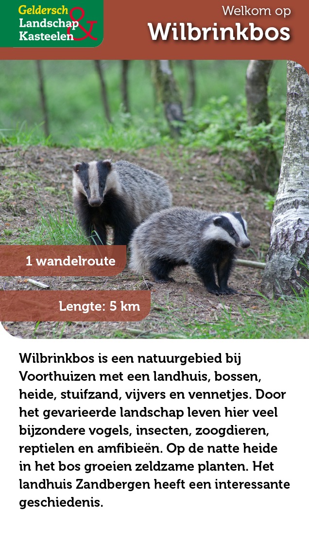 In het Wilbrinkbos bij Voorthuizen is volop afwisseling. Je wandelt in een natuurlijk landschap met bos, houtwallen, heide en vennetjes. Rond landhuis Zandbergen wandel je door een parkachtige landschap. Bijzonder is de stuifwal, die hoog oprijst uit het bos.