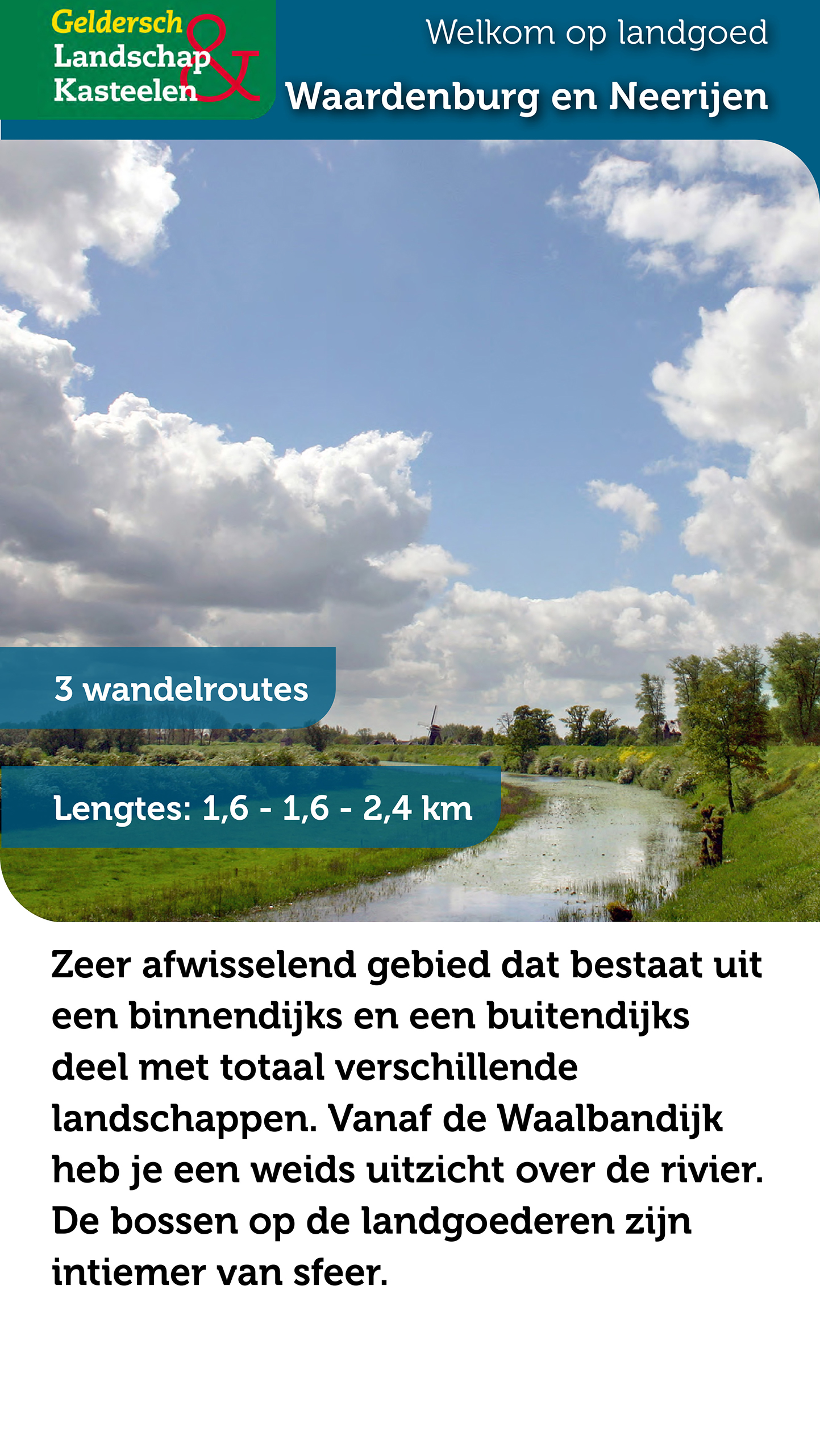 Zeer afwisselend gebied dat bestaat uit een binnendijks en een buitendijks deel met totaal verschillende landschappen. Vanaf de Waalbandijk heb je een weids uitzicht over de rivier. De bossen op de landgoederen zijn intiemer van sfeer.